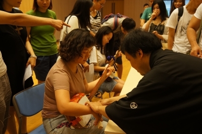 | (参与者体验环节) | (三味线爱好者与奥濑讲师进行交流) |